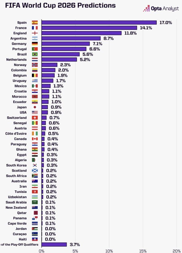 サッカー記録専門媒体の「オプタ(Opta)」が、2026年北中米ワールドカップの組み合わせ抽選を前に行った初期予測で、韓国代表の優勝確率を0.3%と予想している。これは全48か国の本大会出場国の中で、共同26位にあたる数値だ。