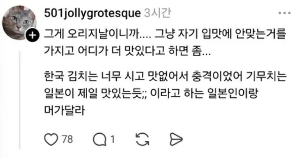 「韓国のキムチは酸っぱすぎてまずくて衝撃だった。キムチは日本が一番うまいと思う」