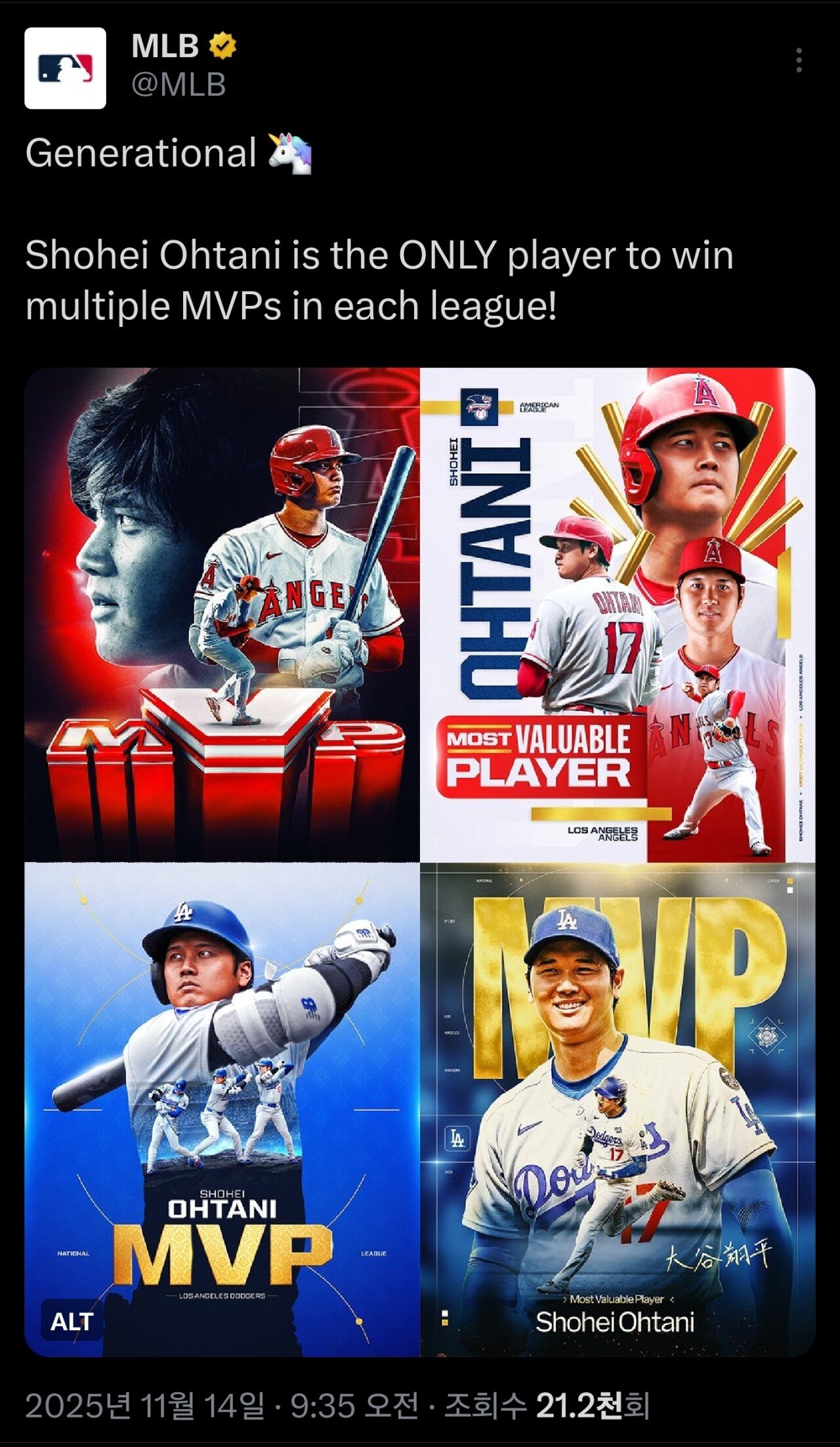 韓国のコミュニティサイトより「[公式]大谷翔平、両リーグでMVPを2回以上受賞した初の選手」というスレの反応を翻訳して紹介します。