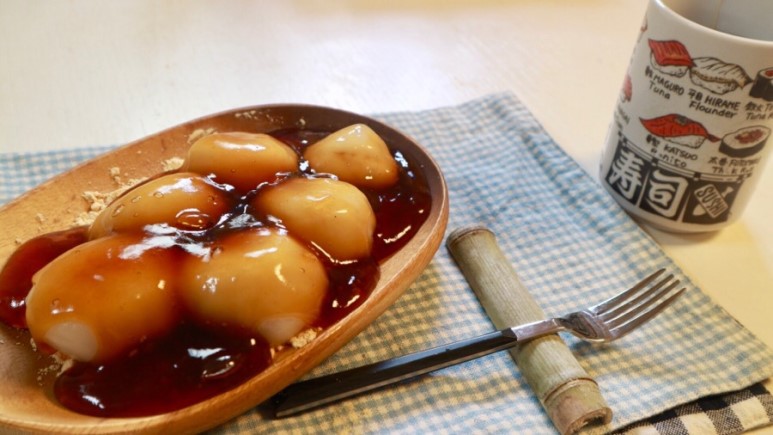 もちもちしたもち米の餅を、黒っぽくて甘いソースに浸して、選んで食べる楽しさがあったのに・・・。