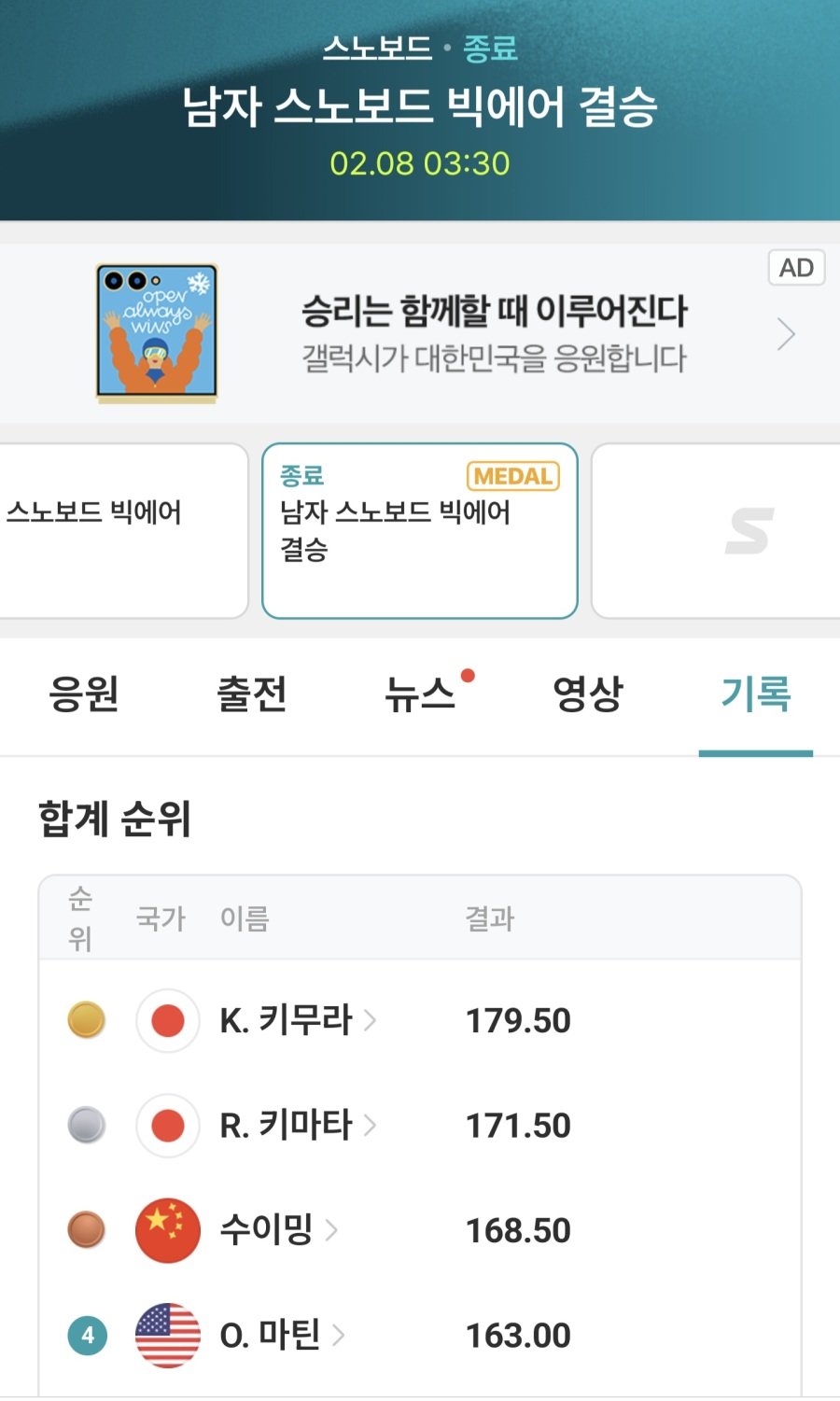 男子スノーボードビッグエア、金銀が日本、銅が中国。