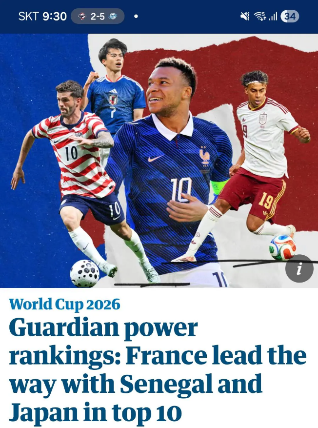 イギリスのガーディアンが発表したワールドカップパワーランキング 韓国(44位) 日本(8位)
